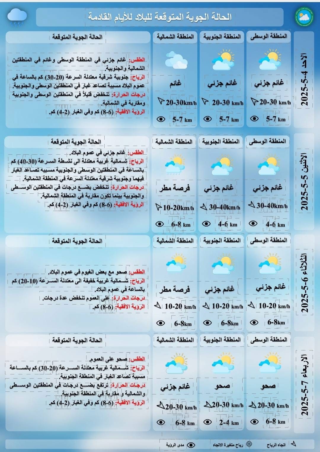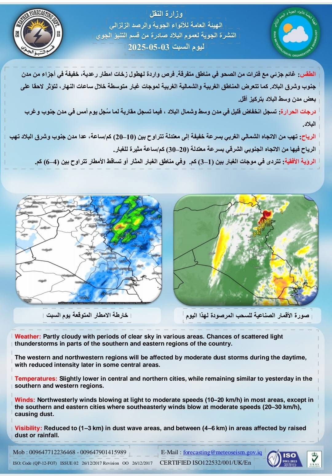 أعلنت الهيئة العامة للأنواء الجوية والرصد الزلزالي، اليوم السبت، توقعاتها لحالة الطقس حيث سيكون غائم جزئي مع فترات من الصحو في مناطق متفرقة فرص واردة لهطول زخات أمطار رعدية، خفيفة في أجزاء من مدن جنوب وشرق البلاد. كما تتعرض المناطق الغربية والشمالية الغربية لموجات غبار متوسطة خلال ساعات النهار، لتؤثر لاحقا على بعض مدن وسط البلاد بتركيز أقل.