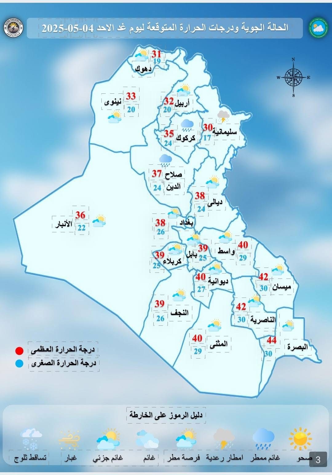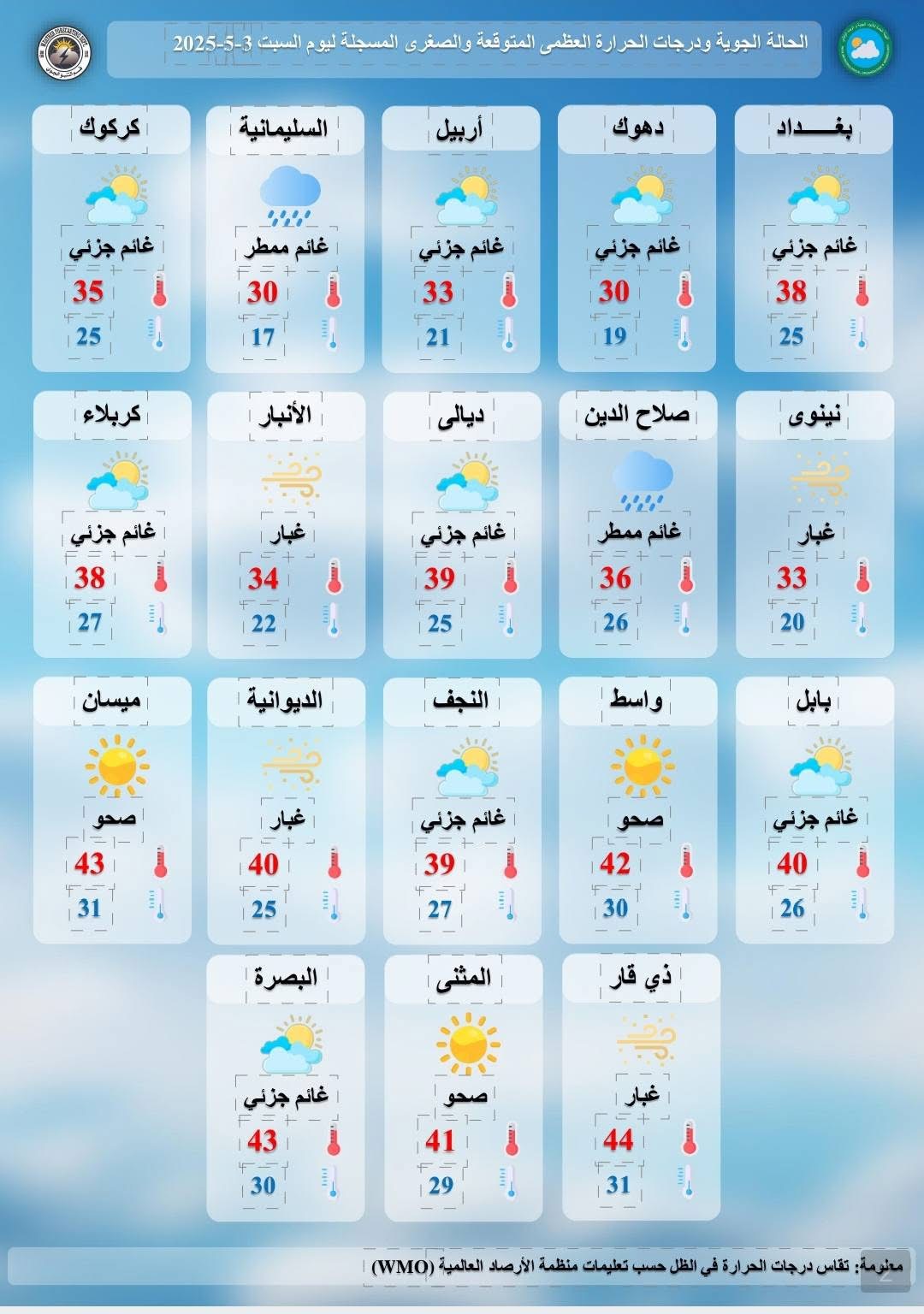 وسجلت العاصمة بغداد درجة حرارة صغرى بلغت 25 وعظمى 38 درجة، فيما سجلت كربلاء، وسط البلاد، 28 درجة صغرى و 38 درجة عظمى.