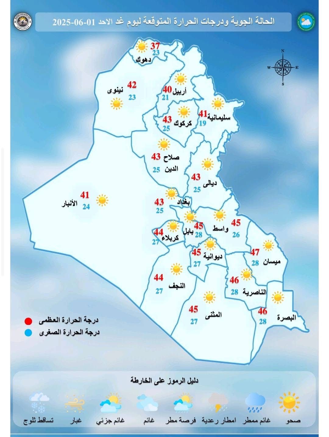 وسجلت العاصمة بغداد درجة حرارة صغرى بلغت 20 وعظمى 40 درجة، فيما سجلت كربلاء، وسط البلاد، 27 درجة صغرى و 40 درجة عظمى