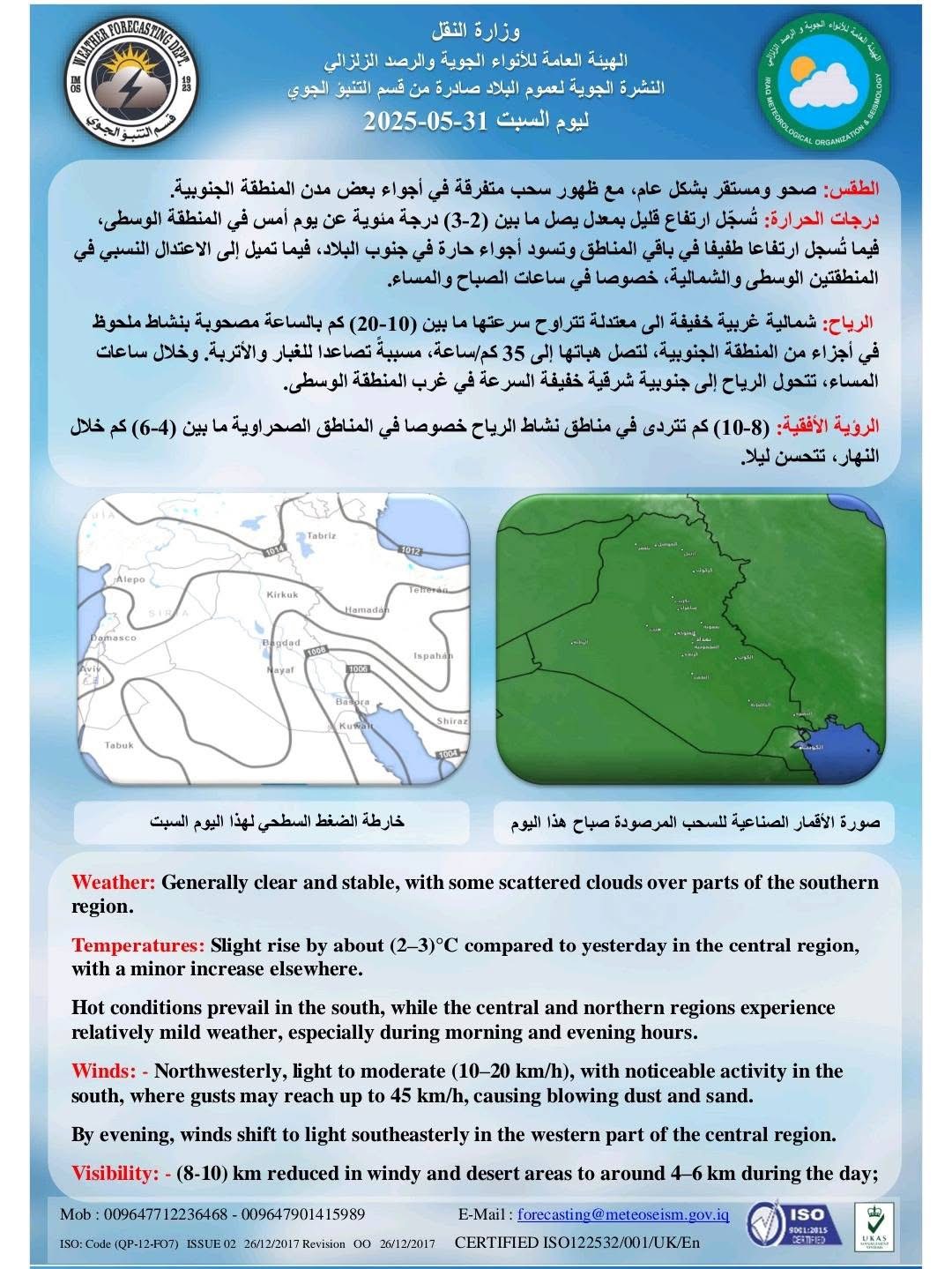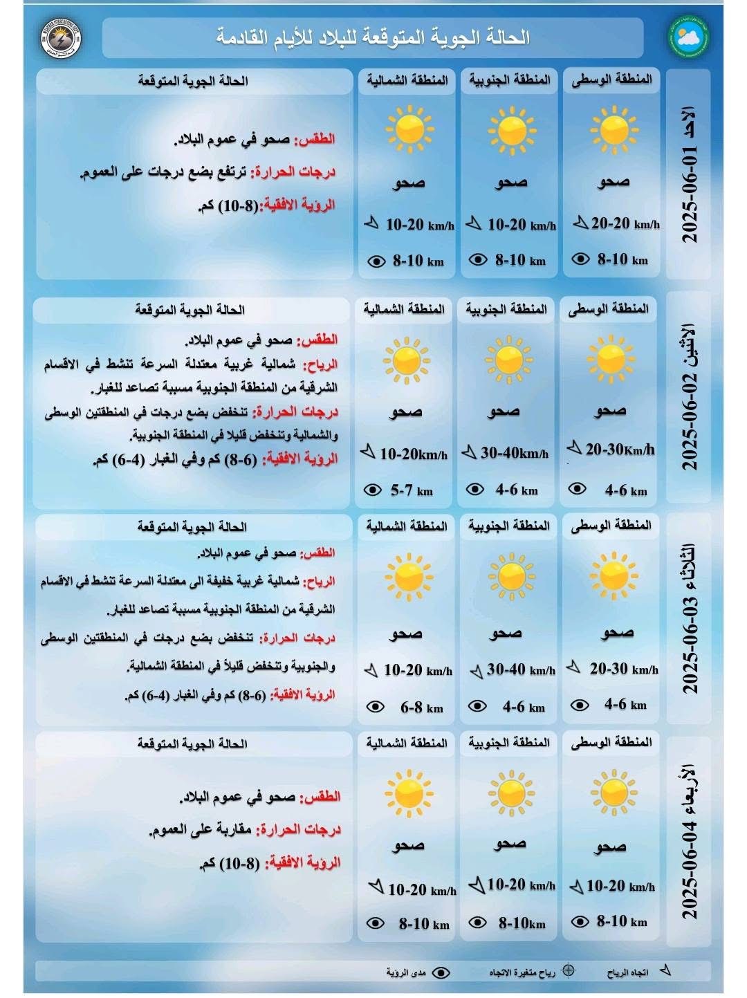 وتوقعت الهيئة "هبوب رياح شمالية غربية خفيفة الى معتدلة تتراوح سرعتها ما بين 10-20 كم بالساعة مصحوبة بنشاط ملحوظ في أجزاء من المنطقة الجنوبية، لتصل هباتها إلى 35 كم / ساعة، مسببة تصاعدا للغبار والأتربة. وخلال ساعات المساء، تتحول الرياح إلى جنوبية شرقية خفيفة السرعة في غرب المنطقة الوسطى".