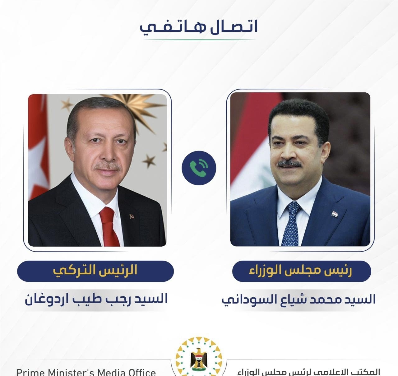 بحث رئيس الوزراء محمد شياع السوداني، ورئيس الجمهورية التركية رجب طيب أردوغان، خلال اتصال هاتفي جرى اليوم الجمعة، جملة من الملفات الأمنية والسياسية والاقتصادية، مع تأكيد مشترك على أهمية تعزيز التنسيق الأمني وملاحقة فلول الإرهاب بما يسهم في دعم استقرار المنطقة.