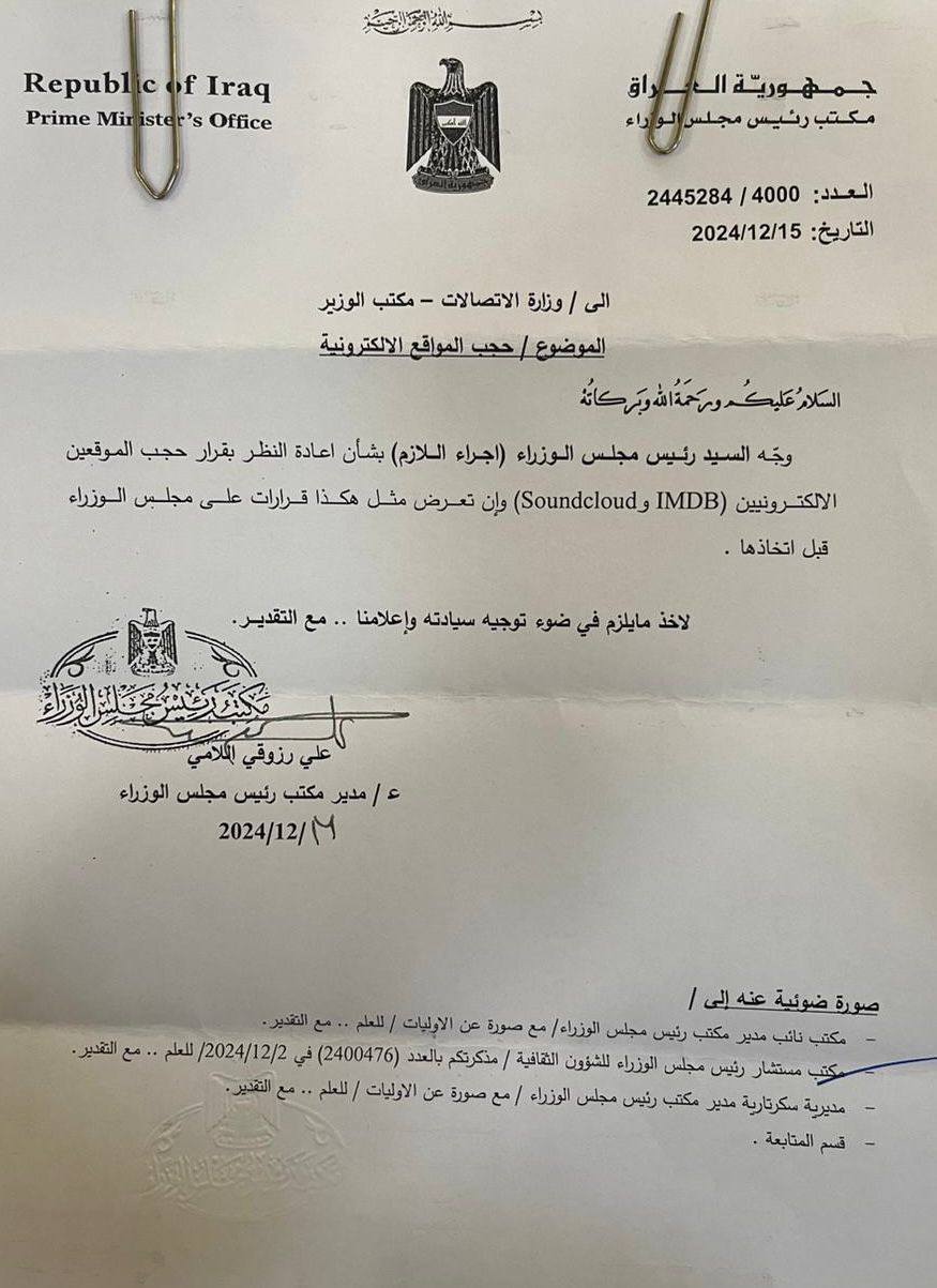 وبحسب وثيقة حصل عليها ( كلمة ) ، فأن "السوداني وجه وزارة الاتصالات باجراء اللازم بشأن اعادة النظر بقرار حجب الموقعين الالكترونيين (IMDB و Soundcloud)".